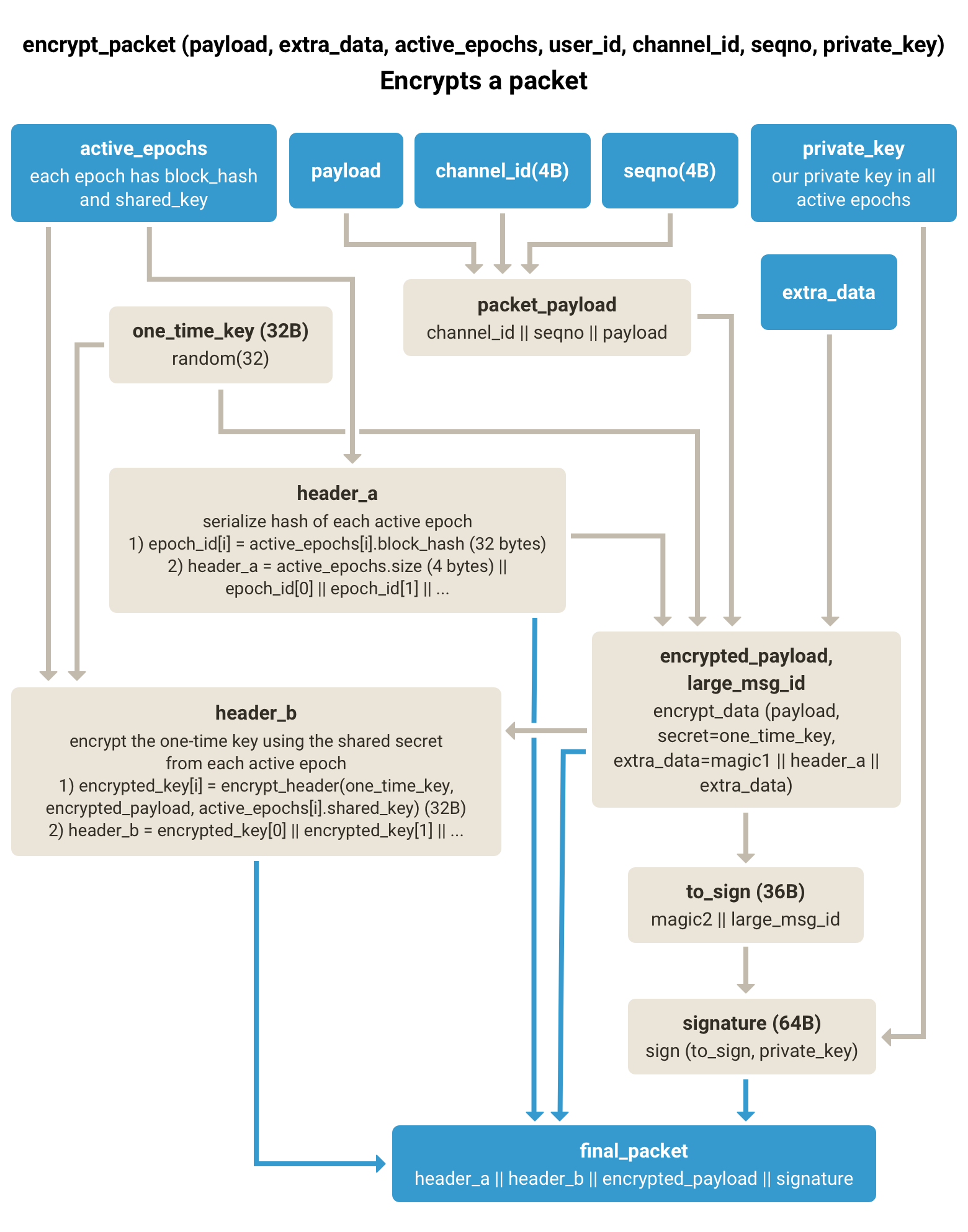 one_time_key = random(32)packet_payload = channel_id (4 bytes) || seqno (4 bytes) || payloadinner_extra_data = magic1 || header_a || extra_dataencrypted_payload, large_msg_id = encrypt_data(packet_payload, one_time_key, extra_data)Generate signature