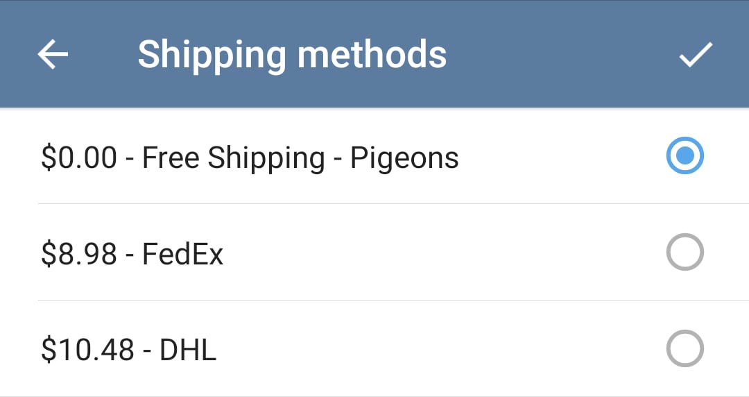 The bot can offer several shipping options for physical goods based on the delivery address. When ready, users enter their credit card info or choose a saved card — and pay for the product. Telegram also supports Apple Pay and Google Pay. Once the transaction is done, the merchant bot can send a receipt message with payment details, shipping and delivery information.